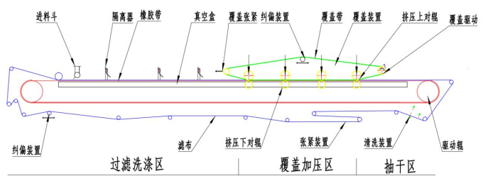 環(huán)形過濾膠帶由電機經(jīng)減速驅(qū)動連續(xù)運行,濾布鋪敷在膠帶上與之同步運行。膠帶與真空室滑臺接觸(真空室與膠帶間有環(huán)形磨擦帶并通入水形成水密封),當真空室接通真空系統(tǒng)時,在膠帶上形成真空,料漿由布料器均勻地布在濾布上,在真空的作用下,濾液穿過濾布經(jīng)膠帶上的橫溝槽匯總并由膠帶中心小孔進入真空室,固體顆粒被截留而形式濾餅;進入真空的液體經(jīng)氣水分離器排出。隨著橡膠帶移動已形成的濾餅依次進入濾餅抽濾區(qū)、覆蓋區(qū)、抽干區(qū);在上下濾布共同包裹下,形成高真空區(qū)域,抽出濾餅中的水分,同時在覆蓋區(qū)有擠壓輥與對輥,在氣缸高壓力線接觸作用下擠壓濾餅,去除濾餅水份;經(jīng)過抽干區(qū)進一步脫水,濾布與膠帶分開,在卸濾餅輥處將濾餅卸出;卸除濾餅的濾布經(jīng)清洗后獲得再生;再經(jīng)過一組支承輥和糾偏裝置后重新進入過濾區(qū)。