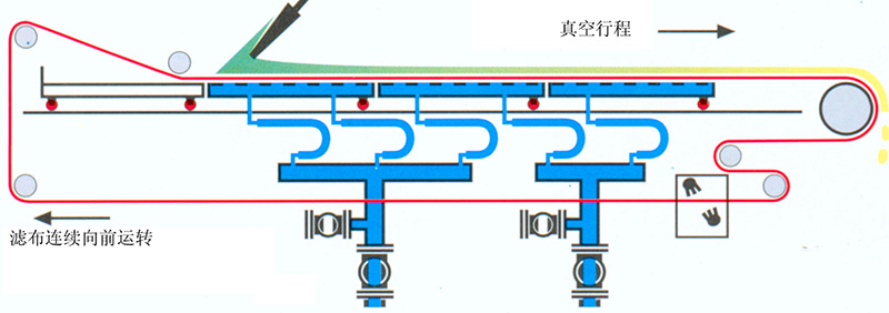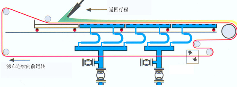 水平真空帶式過濾機是在工業生產中較為常見的一種固液分離裝置,水平真空帶式過濾機的過濾和分離性能較好,能過濾分離多種固液混合漿料,水平真空帶式過濾機是以真空吸力作為動力來完成過濾過程,同時在物料通過沉淀區時,固體物質的大小顆粒有序排列,大顆粒排列在底層,小顆粒排列在上層,這樣水平真空帶式過濾機能獲得更好的濾餅結構,減小濾液的通透阻力,增加過濾速度。水平真空帶式過濾機是高自動化的機械設備,本身具備自動下料、過濾、洗滌、脫渣及濾布清洗等功能,并能保證以上過程為連續自動化操作,不影響正常生產的進行。水平真空帶式過濾機的應用有利于提高企業的生產效率,降低過濾過程的運行成本。