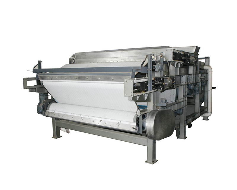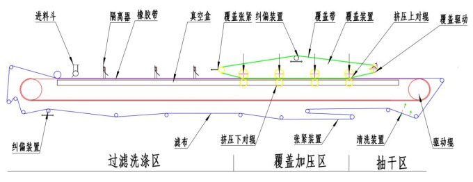 智能壓榨過濾機的過濾單元由交替排列的隔膜濾板和廂式濾板以及夾在其間的過濾介質構成的多組濾室,每組濾室容積可在一定范圍內改變。工作時,由供料泵將漿料壓入濾室形成流體壓力,濾液穿過濾布并沿濾板的導流間隙流至濾板邊角通道,集中排出,固體顆粒被截留在濾布上形成濾餅,直至積滿濾室,過濾完畢。之后壓榨介質(水或氣)由壓榨通道進入隔膜腔并形成壓力,將濾餅中殘液擠出經導流間隙至邊角通道。隨后通入高壓空氣至濾餅一側,在壓力的作用下,氣流穿過濾餅并帶走殘液。濾板整體拉開卸除濾渣,清洗濾布,重新壓緊濾板,開始下一工作循環。