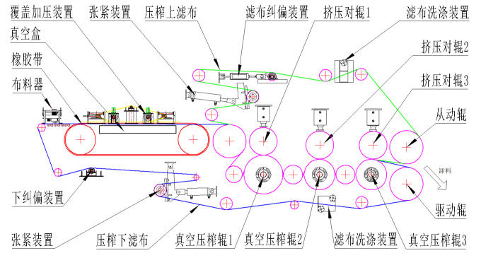 設(shè)備由真空覆蓋加壓脫水段和真空高壓碾壓脫水段。設(shè)備由布料器、橡膠帶、真空盒、覆蓋加壓裝置、真空高碾壓裝置、驅(qū)從動(dòng)輥、濾布、濾布糾偏裝置、濾布再生裝置、機(jī)架等部件組成。它是以濾布為過濾介質(zhì)充分利用真空吸力和壓榨脫水實(shí)現(xiàn)固液分離的設(shè)備。