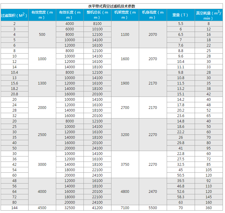 水平帶式真空過濾機(jī)的過濾效率高,由于是水平過濾面上加料形式,料漿中的大顆粒由于沉降速度大于細(xì)粒子所以它很快沉降到過濾面上形成一層透水率較高的初濾層。初濾層的阻力小,對(duì)細(xì)顆粒又起到了一定的捕集作用,從而使濾餅層結(jié)構(gòu)合理。又減少了細(xì)小粒子造成的濾布阻塞,因而過濾阻力小、過濾效率高、濾液澄清度高。